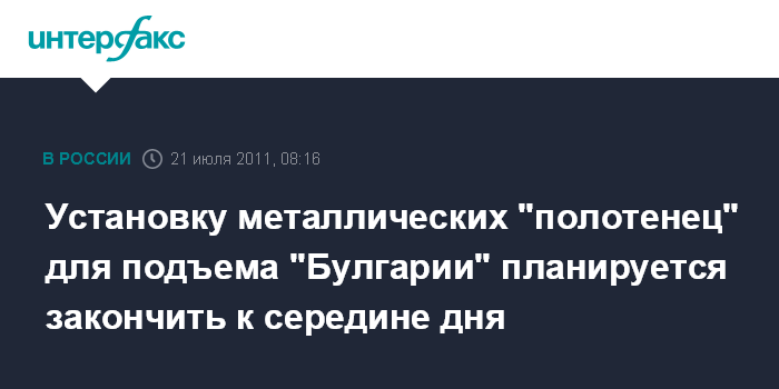"Осталось еще одно "полотенце". Завод его под носовую часть "Булгарии" продолжается. Мы планируем, что если не произойдет никаких чрезвычайных ситуаций, то эта работа закончится к обеду сегодняшнего дня", - пояснил собеседник агентства.