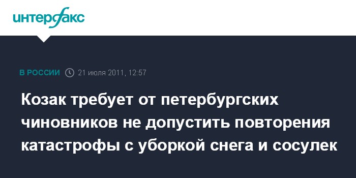 Москва. 21 июля. INTERFAX.RU - Вице-премьер Дмитрий Козак пригрозил руководству Санкт-Петербурга привлечением к ответственности, если в городе этой зимой вновь повторится безобразная ситуация с уборкой снега и сосулек.