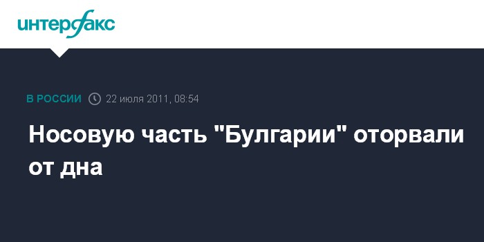 Куйбышевский затон. 22 июля. INTERFAX.RU - Специалисты утром в пятницу выполнили работы по отрыву носовой части затонувшего теплохода "Булгария" от дна, сообщил агентству "Интерфакс-Поволжье" официальный представитель оперативного штаба по проведению операции Тимур Хикматов.