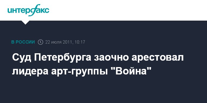 Санкт-Петербург. 22 июля. INTERFAX.RU - Дзержинский районный суд Петербурга на заседании в пятницу заочно арестовал лидера арт-группы "Война" Олега Воротникова.