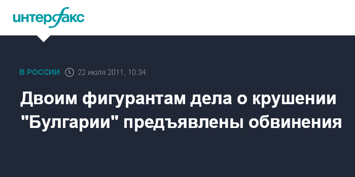 Москва. 22 июля. INTERFAX.RU - Следственный комитет России предъявил обвинения генеральному директору ООО "АргоРечТур" 40-летней Светлане Инякиной и старшему эксперту Камского филиала Речного регистра 62-летнему Якову Ивашову в рамках уголовного дела о крушении теплохода "Булгария" на Волге, сообщил "Интерфаксу" официальный представитель СК РФ Владимир Маркин.