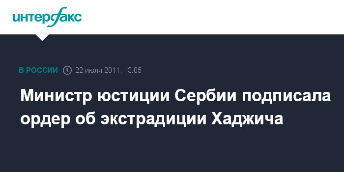 Москва. 22 июля. INTERFAX.RU - Министр юстиции Сербии Снежена Малович подписала ордер об экстрадиции в Гаагу бывшего президента республики Сербская Краина Горана Хаджича. Об этом сообщает телерадиокомпания B92.