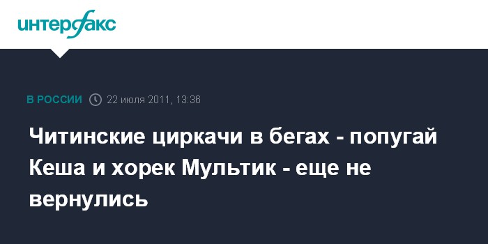 Чита. 22 июля. INTERFAX.RU - Сотрудники читинского цирка "Шапито" не теряют надежды найти попугая Кешу и хорька Мультика, сбежавших от депрессии, вызванной затяжными дождями.