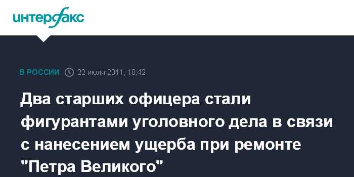 Москва. 22 июля. INTERFAX.RU - Военное следственное управление Следственного комитета РФ по Северному флоту возбудило уголовное дело в отношении начальника 1118-го военного представительства Минобороны России капитана 2 ранга Виталия Вагиса, а также командира электромеханической боевой части тяжелого атомного ракетного крейсера "Петр Великий" капитана 1 ранга Владимира Таякина.