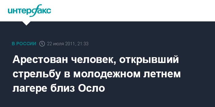 Осло. 22 июля. INTERFAX.RU - Человек, открывший стрельбу в летнем молодежном лагере правящей в Норвегии Трудовой партии, арестован, передает в пятницу норвежский телерадиоканал NRK.