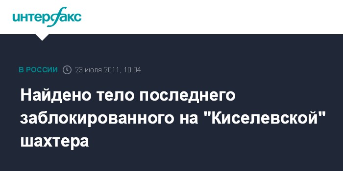 Кемерово. 23 июля. INTERFAX.RU - Тело четвертого горняка, погибшего в результате аварии более месяца назад на шахте "Киселевская" в Кемеровской области, обнаружено спасателями, сообщила в субботу агентству "Интерфакс-Сибирь" официальный представитель СУ СКР по региону Надежда Ананьева. По ее данным, в настоящее время проводятся работы по поднятию тела на поверхность.