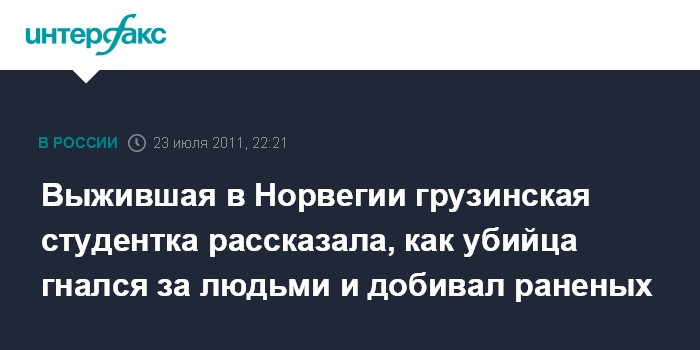 Тбилиси. 23 июля. ИНТЕРФАКС - Студентка из Грузии Натия Чхетиани, попавшая в эпицентр массового убийства людей на острове Утойя в Норвегии по телефону рассказала грузинской телекомпании "Рустави-2" подробности трагедии.