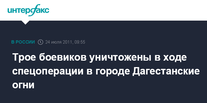 Ростов-на-Дону. 24 июля. INTERFAX.RU - Трое участников незаконных вооруженных формирований, в том числе женщина, уничтожены в ходе спецоперации, завершившейся в воскресенье утром в городе Дагестанские Огни, сообщили агентству "Интерфакс-Юг" в Дербентском РОВДю "По предварительным данным, во время осмотра домовладения, где были заблокированы боевики, уничтожены трое бандитов, среди которых была одна женщина", - сказал собеседник агентства.