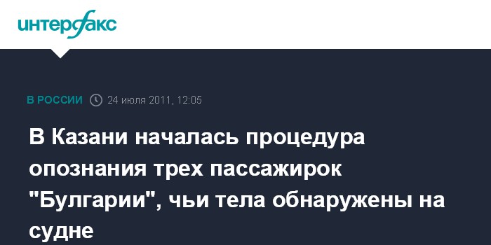 Казань. 24 июля. INTERFAX.RU - В 11:30 мск с Республиканское бюро судмедэкспертизы в Казани доставлены тела трех женщин из числа погибших при крушении теплохода "Булгария", которые были обнаружены водолазами на судне в воскресеньею "В настоящее время начнется процедура опознания тел родственниками", - сообщила агентству "Интерфакс-Поволжье" пресс-секретарь Минздрава Татарстана Гульнара Сабирова.