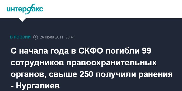 Пятигорск. 24 июля. ИНТЕРФАКС - Около 100 сотрудников правоохранительных органов России погибли на Северном Кавказе при проведении спецопераций в 2011 году, сообщил в воскресенье глава МВД РФ Рашид Нургалиев, выступая на оперативном сборе с личным составом главного управления министерства по СКФО.