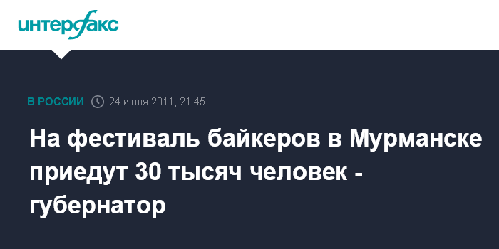 Мурманск. 24 июля. ИНТЕРФАКС - Около 30 тысяч человек примут участие в ежегодном байкерском фестивале "Arctic riders 2011" в Мурманске с 11 по 14 августа, сообщил "Интерфаксу" губернатор области Дмитрий Дмитриенко.