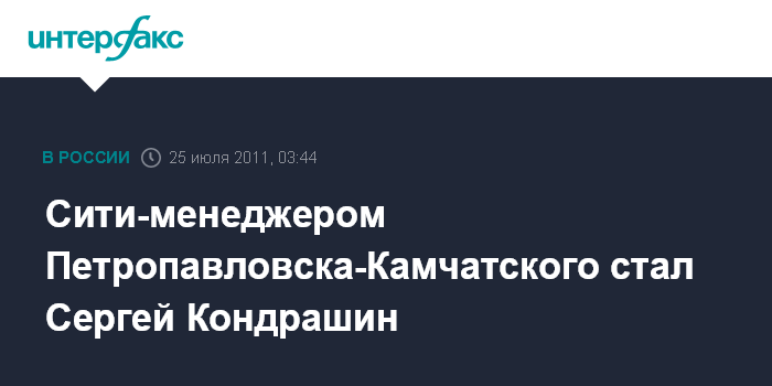 Петропавловск-Камчатский. 25 июля. ИНТЕРФАКС-ДАЛЬНИЙ ВОСТОК - Главой администрации Петропавловска-Камчатского утвержден Сергей Кондрашин, ранее занимавший должность первого заместителя главы администрации краевого центра.
