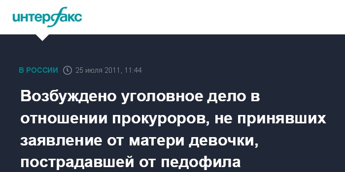 Москва.25 июля. INTERFAX.RU - Следственный комитет РФ возбудил уголовное дело по статье "халатность" в отношении двух работников прокуратуры Амурской области, которые не приняли заявление от матери семилетней девочки, пострадавшей от предполагаемого педофила, сообщил "Интерфаксу" в понедельник старший помощник следственного управления СК РФ по Амурской области Алексей Лубинский.