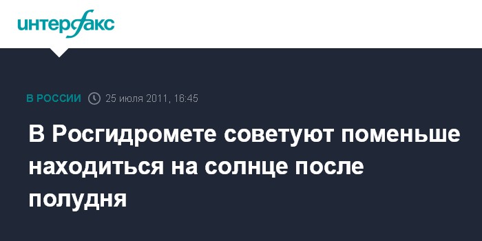 Москва. 25 июля. INTERFAX.RU - Метеорологи предупреждают о повышенной опасности солнечных лучей в условиях установившейся в России жаркой погоды. "В таких условиях в околополуденные часы при малооблачной погоде индекс ультрафиолетовой облученности будет достигать опасных значений: на севере Европейской России ультрафиолетовый индекс (УФИ) 6-7, в центральных областях и на юге Дальнего Востока - 6-8, в Приазовье и на черноморском побережье Кавказа - 7-9. Между тем опасным считается индекс 6 и более" - говорится в сообщении Федеральная служба по гидрометеорологии и мониторингу окружающей среды, поступившем в "Интерфакс" в понедельник.
