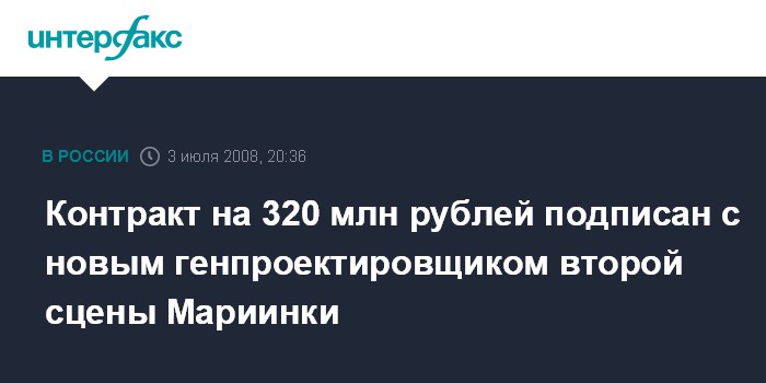 Санкт-Петербург. 3 июля. ИHТЕРФАКС СЕВЕРО-ЗАПАД - ФГУ "Северо-Западная дирекция по строительству, реконструкции и реставрации" подписало контракт на сумму 320 млн рублей с новым генпроектировщиком второй сцены Мариинского театра, сообщает в четверг пресс-служба дирекции.
