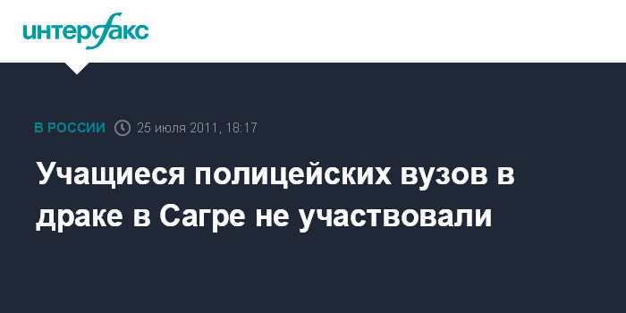 Москва. 25 июля. INTERFAX.RU - В МВД опровергли появившиеся в СМИ сообщения о том, что в массовом конфликте в поселке Сагра в Свердловской области участвовали учащиеся полицейских вузов. "Данная информация не соответствует действительности", - заявили "Интерфаксу" в пресс-центре МВД в понедельник.