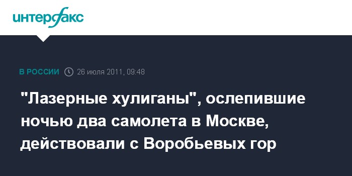 Москва. 26 июля. INTERFAX.RU - Неизвестные в Москве минувшей ночью дважды пытались ослепить лазером экипажи пассажирских самолетов, сообщил во вторник "Интерфаксу" источник в правоохранительных органах региона.
