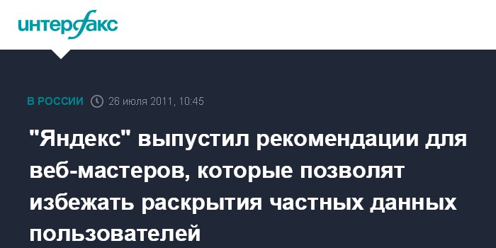Москва. 26 июля. INTERFAX.RU – Крупнейшая российская поисковая система "Яндекс" на волне продолжающихся скандалов вокруг раскрытия частных данных пользователей в Сети опубликовала рекомендации для владельцев сайтов и веб-мастеров, в которых разъясняет механизмы попадания подобной информации в Сеть. Ранее пресс-служба поисковика распространила сообщение, в котором заявила, что "рекомендует администраторам сайтов внимательно изучать информацию о файле robots.txt и его корректном использовании".