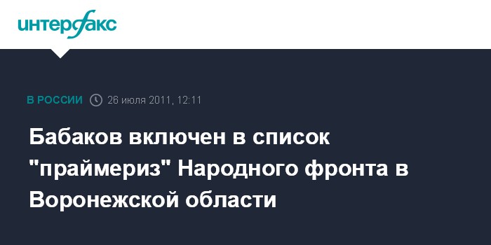 Воронеж. 26 июля. INTERFAX.RU - Вице-спикер Госдумы от фракции "Справедливая Россия" Александр Бабаков входит в размещенный на сайте Общероссийского Народного фронта список кандидатов от Воронежской области для участия в так называемых "праймериз".