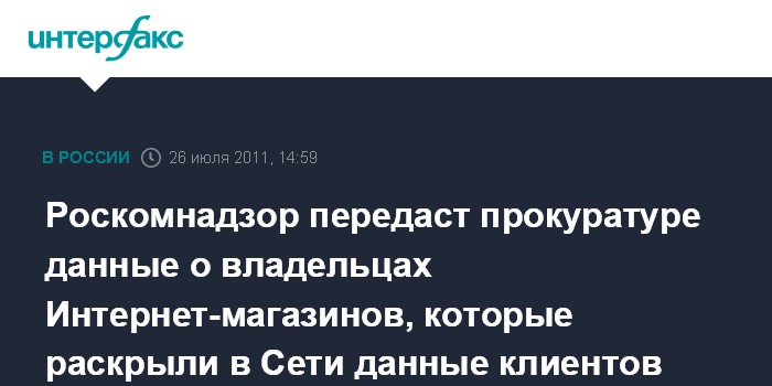 Москва. 26 июля. INTERFAX.RU – Роскомнадзор начал проверку фактов нарушений законодательства о персональных данных со стороны магазинов дистанционной торговли (интернет-магазинов), допустивших распространение сведений о покупателях в сети Интернет, говорит в сообщении, размещенном на сайте ведомства.