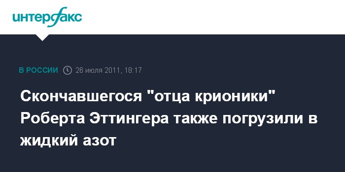 Лондон. 26 июля. INTERFAX.RU - Создатель концепции крионики 92-летний Роберт Эттингер умер в минувшую субботу в своем доме в пригороде Детройта, сообщила британская газета Guardian.