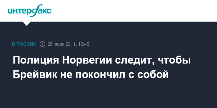 Осло. 26 июля. INTERFAX.RU - Подозреваемый в совершении двойного теракта в Норвегии Андерс Брейвик находится под надзором полиции с целью предотвращения самоубийства, заявили на пресс-конференции местные стражи правопорядка.