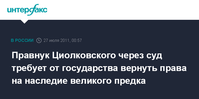 Москва. 27 июля. ИНТЕРФАКС - Пресненский суд Москвы в среду рассмотрит иск правнука основоположника космонавтики Константина Циолковского к правительству РФ с требованием признать за ним наследственные права на рукописи его прадеда.