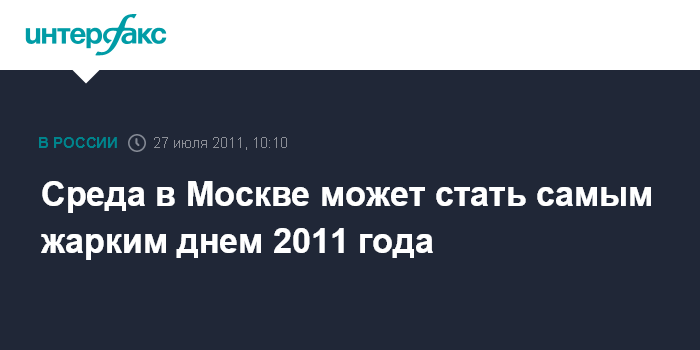 Москва. 27 июля. INTERFAX.RU - Предстоящим днем в среду температура атмосферного воздуха в столице может прогреться до максимальной с начала 2011 года отметки - 34 градусов, сообщили "Интерфаксу" в Гидрометеобюро Москвы и Московской области. "Таким образом, 27 июля может стать самым жарким днем года. В минувший вторник в столице была зафиксирована температура на уровне 33,5 градуса", - отметил собеседник агентства.
