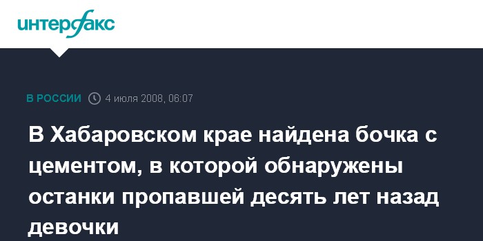 Хабаровск. 4 июля. ИНТЕРФАКС-ДАЛЬНИЙ ВОСТОК - В Хабаровском крае в куче бытового мусора возле карьера в районе автотрассы поселка Переяславка-Невельское найдена 200-литровая бочка, залитая раствором цемента, в которой обнаружены останки девочки 6-7 лет и фрагменты детской одежды.