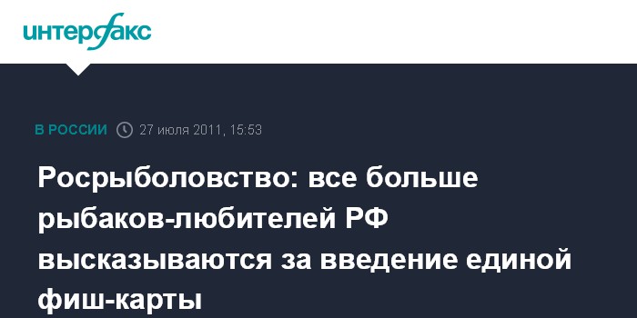 "Первые результаты общественного обсуждения закона о спортивном и любительском рыболовстве показали, что число тех, кто поддерживает идею введения в стране единой карты рыбака (так называемой фиш-карты, или специального билета - ИФ), становится все больше", - заявил "Интерфаксу" руководитель центра общественных связей Росрыболовства Александр Савельев.
