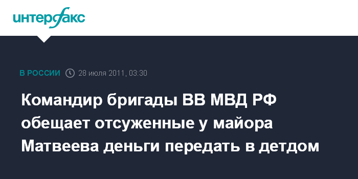 Командир бригады ВВ МВД РФ обещает отсуженные у майора Матвеева деньги передать в детдом