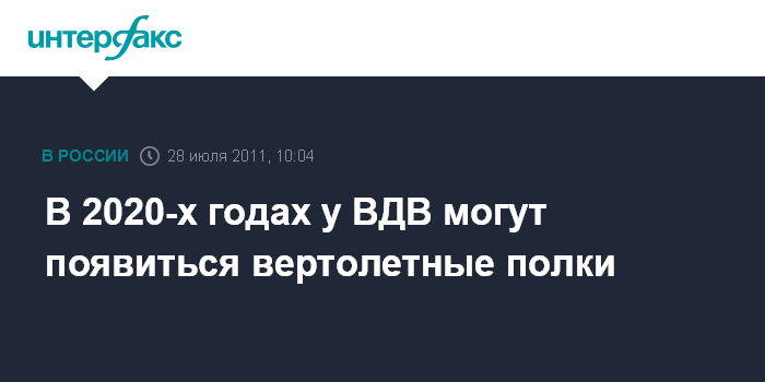 Москва. 28 июля. INTERFAX.RU - Вертолетные полки в составе Воздушно-десантных войск (ВДВ) могут быть созданы в 2020-х годах, сообщил журналистам в четверг начальник штаба ВДВ генерал-лейтенант Николай Игнатов.