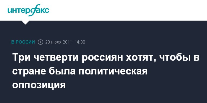 Москва. 28 июля. INTERFAX.RU - О необходимости существования политической оппозиции в России заявляют все больше граждан страны, опрошенных социологами. Так, если летом 2009 года чуть более половины (51%) граждан заявляли о необходимости существования в РФ политической оппозиции, то к июлю текущего таковых стало уже 73%, сообщили в четверг "Интерфаксу" социологи "Левада-Центра" по результатам всероссийского опроса.