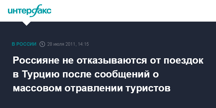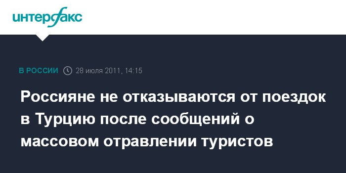 Москва. 28 июля. INTERFAX.RU – Туристы не отказываются от уже забронированных поездок в Турцию после массового отравления граждан РФ в одном из отелей этой страны, сообщил "Интерфаксу" представитель туристической компании Coral Travel.