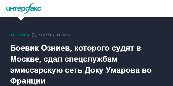 Москва. 28 июля. INTERFAX.RU - Неудавшийся подрывник зданий в Москве Руслан Озниев выдал российским спецслужбам группу сообщников во Франции, занимавшихся подготовкой терактов в России, сообщает Центр общественных связей ФСБ РФ. В четверг Мосгорсуд должен огласить приговор Озниеву, которого считают сподвижником одного из лидеров кавказского бандподполья Доку Умарова и обвиняемого в подготовке подрывов домов и зданий ОВД в Москве в 2009 году.