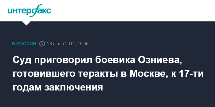 Москва. 28 июля. INTERFAX.RU - Мосгорсуд в четверг приговорил к 17-ти годам заключения Руслана Озниева - сподвижника лидера кавказского бандподполья Доку Умарова, признав его виновным в подготовке подрывов домов и зданий ОВД в Москве в 2009 году.