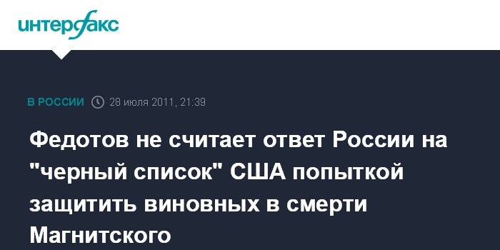 "Ответные меры России на визовые ограничения, о которых объявили США, не надо интерпретировать, как стремление России защитить людей, виновных в смерти Магнитского. Очевидно, что это вынужденный ответ, обусловленный многовековой историей визовых отношений во всем мире", - сказал М.Федотов.