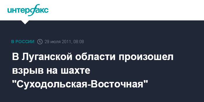 Луганск. 29 июля. INTERFAX.RU - В пятницу ночью около 1 часа произошел взрыв на шахте "Суходольская-Восточная" в Краснодоне Луганской области, сообщает пресс-служба МинЧС Украины в Луганской области.