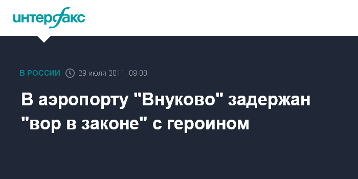 Москва. 29 июля. INTERFAX.RU - В аэропорту "Внуково" сотрудники полиции задержали "вора в законе" по прозвищу "Зюзя", у которого изъяли героин, сообщил Интерфаксу" источник в правоохранительных органах в пятницу.