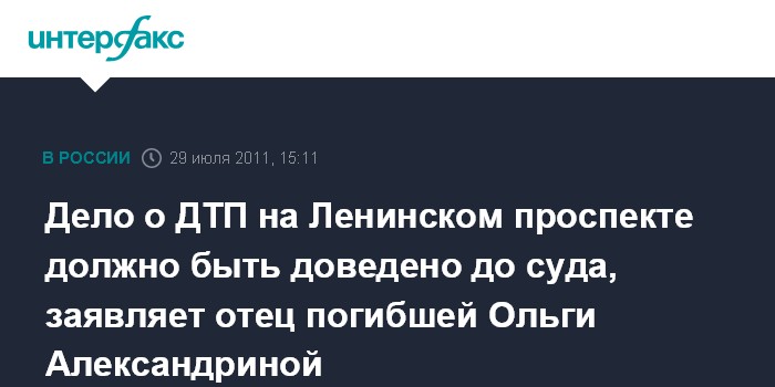 Москва. 29 июля. INTERFAX.RU - Отец Ольги Александриной, погибшей в ДТП на Ленинском проспекте в феврале 2010 года с участием автомобиля вице-президента "ЛУКОЙЛа" Анатолия Баркова, будет настаивать на доведении дела по факту аварии до суда.
