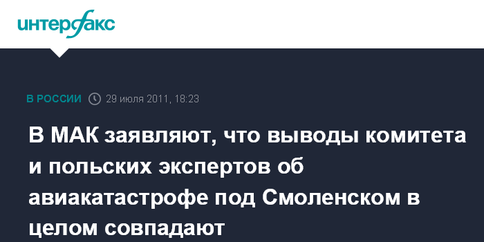 Москва. 29 июля. INTERFAX.RU - Доклад госкомиссии Польши по результатам расследования катастрофы самолета польского президента под Смоленском 10 апреля 2010 года в целом соответствует выводам, ранее сделанным Межгосударственным авиационным комитетом (МАК), заявил глава технической комиссии МАК Алексей Морозов.
