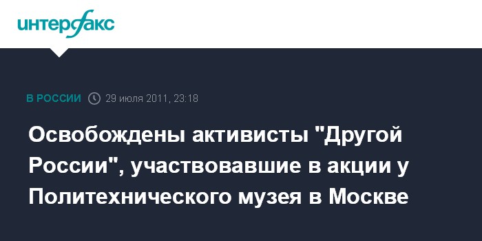 Москва. 29 июля. ИНТЕРФАКС - Двое активистов незарегистрированной оппозиционной партии "Другая Россия", задержанные в пятницу вечером в Москве после того, как они вывесили на фасаде Политехнического музея плакат в поддержку своей арестованной соратницы Таисии Осиповой, освобождены.