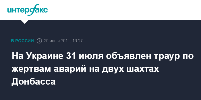 Киев. 30 июля. INTERFAX.RU - В связи с авариями 29 июля на шахтах "Суходольская-Восточная" в Луганской области и имени Бажанова ГП "Макеевуголь" в Донецкой области и привели к человеческим жертвам, воскресенье, 31 июля, на Украине объявлено днем траура. Соответствующий указ президент Украины Виктор Янукович подписал в субботу, информирует пресс-служба главы государства.
