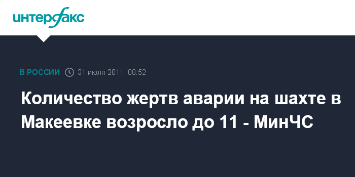 Киев. 31 июля. INTERFAX.RU - По состоянию на 8:00 мск воскресенья количество жертв аварии на шахте им.Бажанова в Макеевке Донецкой области возросло до 11, сообщает пресс-служба МинЧС Украины.