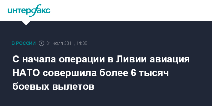 Брюссель. 31 июля. INTERFAX.RU - Натовская авиация совершила за сутки 30 июля 128 вылетов в рамках операции "Объединенный защитник" в Ливии, в том числе 50 вылетов с целью нанесения ударов, сообщило военное командование НАТО в воскресенье в своем коммюнике.