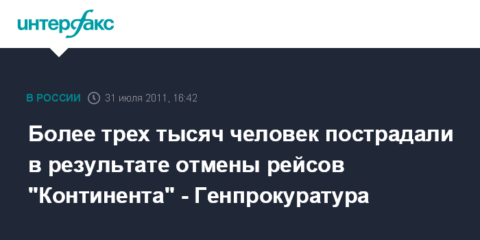 Москва. 31 июля. INTERFAX.RU - Руководство Генеральной прокуратуры поручила транспортным прокурорам принять меры по защите прав нескольких тысяч пассажиров, пострадавших в результате отмены рейсов обанкротившейся авиакомпании "Континент".