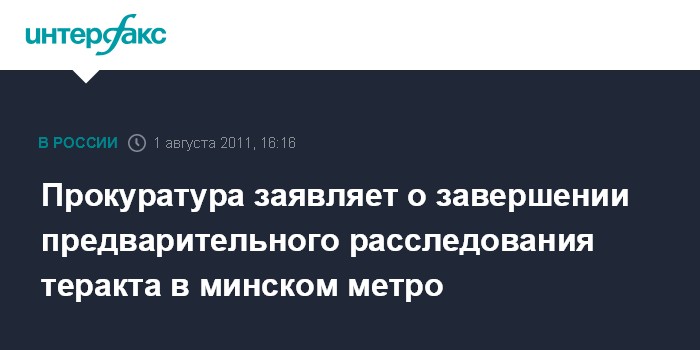 Минск. 1 августа. INTERFAX.RU - Предварительное расследование теракта, произошедшего в минском метро в апреле 2011 года, а также взрывов в Минске в 2008 году и в Витебске в 2005 году, закончено, сообщил журналистам в понедельник в Минске заместитель генерального прокурора Белоруссии Андрей Швед.