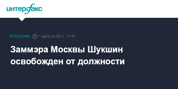 "Мэр Москвы подписал указ об освобождении с 31 августа 2011 года Владимира Семеновича Шукшина от должности заместителя мэра Москвы в правительстве Москвы по координации и работе с правоохранительными органами по собственному желанию в связи с переходом на другую работу", - сказали в пресс-службе столичного градоначальника.