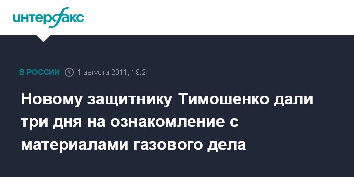 Киев. 1 августа. INTERFAX.RU - Судья Печерского райсуда Киева Родион Киреев далее время новому защитнику экс-премьера Украины, лидера партии "Батькивщина" Юлии Тимошенко Юрию Сухову на ознакомление с материалами газового дела до 10.00 4 августа.