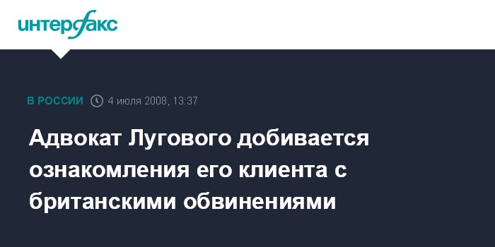 Адвокат пояснил, что в качестве основания для отказа в ознакомлении с материалами была названа причина, что "мы не являемся стороной по делу, а Луговой является свидетелем". "Луговой не ознакомлен с содержанием обвинения выдвинутого против него Англией и, естественно, единственным выходом для нас является обращение в суд с тем, чтоб нам предоставили материалы", - отметил Ромашов, добавив, что защита будет обращаться в судебные органы.